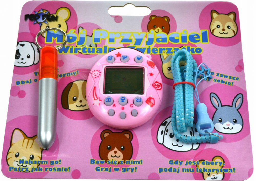 Elektronická hračka Tamagoči. Tvarem připomíná malé plastové vajíčko s malými tlačítky a displejem. Celá věc je řízena jednoduchým vestavěným počítačem. Hra spočívá v péči o virtuální zvířátko - musíte ho krmit, mýt, uklízet po něm atd. Hračka visí na řetízku.Rozměry hračky: 6,5 x 5,5 x 1,5 cm