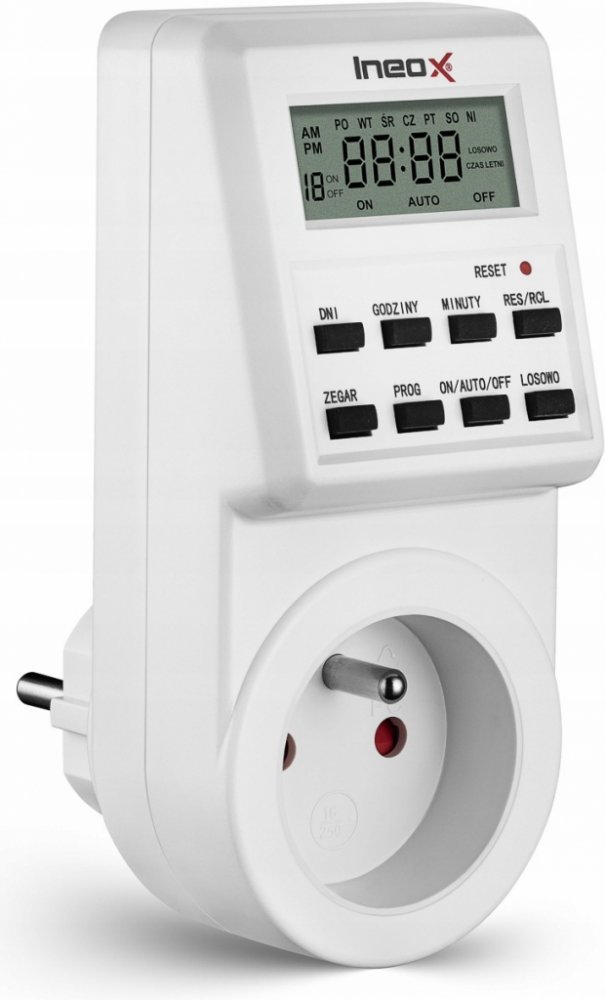 Programátor má polské popisy tlačítek a zpráv na displeji a má až 20 operací ON/OFF denně.
