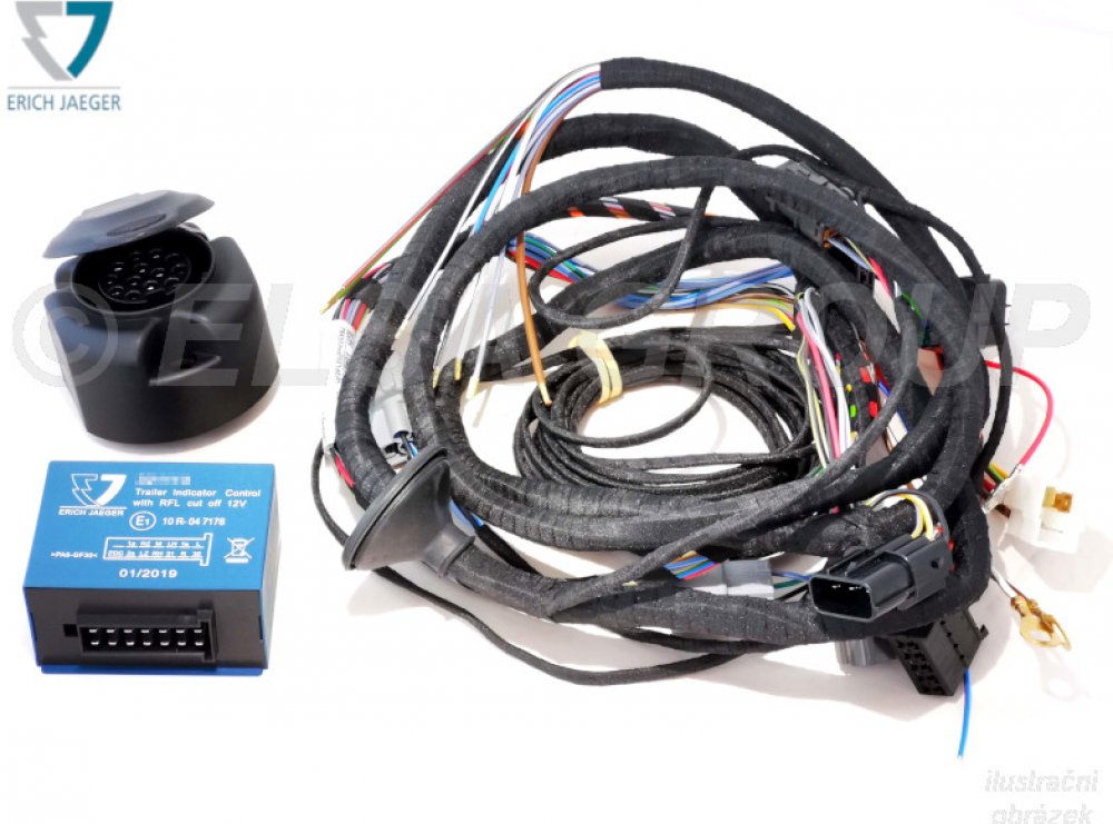 Typová 13-ti pinová elektropřípojka. S odpojením mlhových světel. Pro vozy bez CAN-bus Snadné připojení do 60 minut za použití typových konektorů bez vrtání a bez nutnosti zásahu do elektroinstalace vozidla. Výrobce: Erich Jaeger, Německo