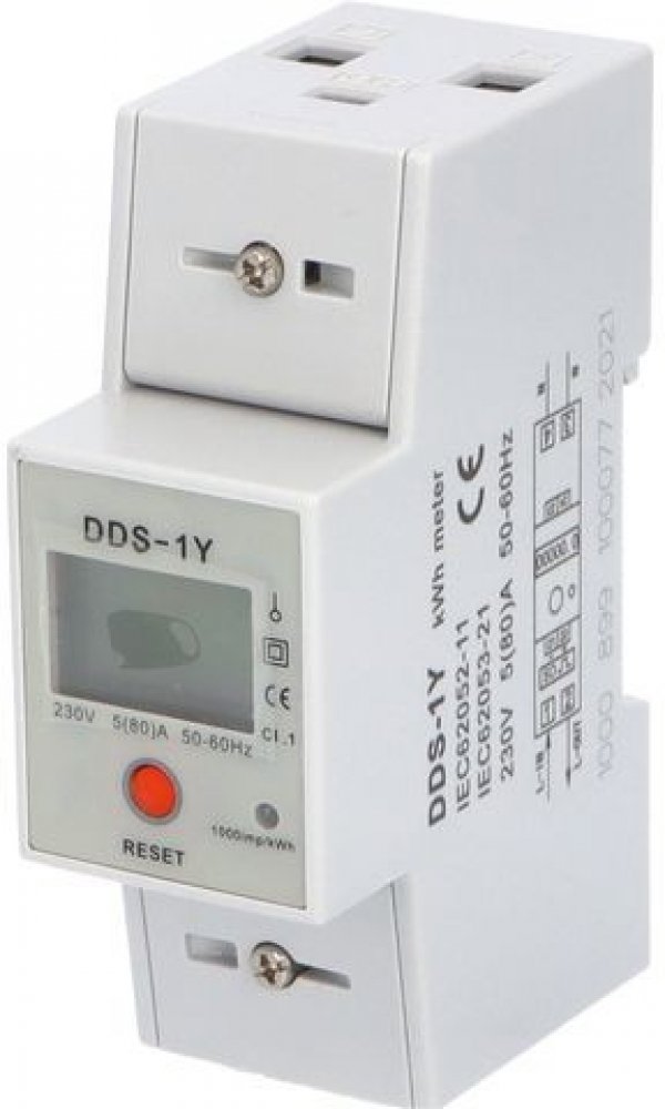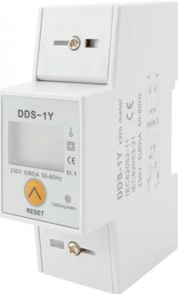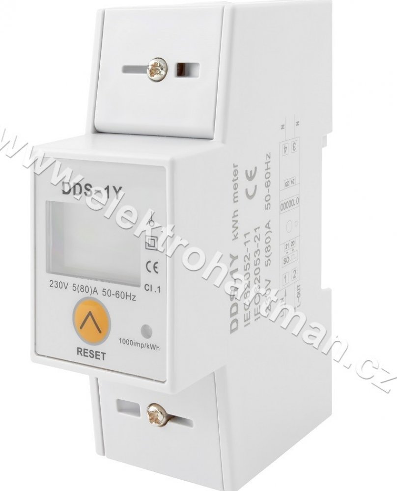 Podružný 1-fázový 1-tarifní digitální elektroměr pro přímé informativní měření DDS-1Y RESET 80A s možností nulování (funkce RESET), 2-modulový, 2-řádkový podsvícený displej Jednofázový elektroměr s LCD displejem pro střídavé napětí 1x230 V, 50Hz , slouží k měření činné elektrické energie v přímém zapojení do obvodu. Je určen na podružná měření spotřeby samostatných spotřebičů nebo spotřebičů ve skupinách. Jedná se o přesný elektroměr, který měří již od minimálních hodnot protékajícího proudu (0,2 A) až po 80 A (startovací proud je 20 mA), LCD displej zobrazuje hodnoty na číselníku od 00000,1 až 99999,9 [kWh] a to bez přivedeného napájení po dobu až 10ti let (záleží na okolním prostředí), dvouřádkový displej (horní řádek lze vynulovat stisknutím tlačítka RESET, spodní řádek nelze vynulovat). Indikační LED bliká při odběru fáze. Elektroměr má impulzní výstup (1000imp. / 1kWh ==>; 1x bliknutí = 0,001 kWh) na svorkách (20) S0+ a (21) S0-. To umožňuje připojení externího zařízení, které počítá impulzy (S0 dle normy DIN 43864) generované elektroměrem. Ke správné funkci elektroměru se nevyžaduje zapojení tohoto doplňkového zařízení. Montuje se na nosnou lištu 35 mm (DIN lištu), vestavná šířka jen 18 mm (1 mod.) -> šetří prostor v rozváděči. Šroubové svorky pro pohodlné připojení vodičů až do průřezu 6 mm2, svorky pro nulový vodič "N" jsou vzájemně (galvanicky) propojené a není nutné rozdělovat "N" vodič. Utahovací moment šroubů : svorka č. 1 a 3 = 1,5 - 2,5 Nm, svorka č. 4 a 6 = 1,5 - 2,5 Nm. svorka č. 20 a 21 = 1,0 - 1,2 Nm. Vlastní spotřeba je menší než 1 W. --- Informace o S0 výstupu --- S0 je rozhraní definované normou DIN 43864 a každý elektroměr by jím měl být vybaven. Stejně tak lze S0 výstup získat z plynoměru, z vodoměru, z měřiče tepla a dalších zařízení. Potřebujete znát množství energie, které elektroměr změřil? Díky S0 rozhraní můžete snadno, přesně a velmi levně získat informace o odběru energie. Napětí ... 12~27 V DC Proud... 27 mA Šířka impulzu ... 90 ms Limitní hodnoty: max. 60 V DC max. 50 mA Elektroměr je vyšší než standardní modulové přístroje (výška 100 mm) jako je např. jistič (s výškou 80 mm) a proto je nutné s tímto počítat a zvolit vhodnou rozvodnici resp. kryt modulových přístrojů. Např. FAMATEL 3604