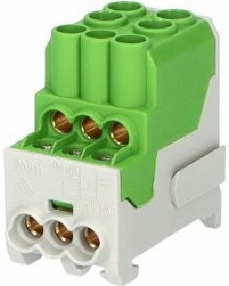 Blok pro rozdělení fází UVB 100 PE, 1pólový, jmenovitý proud 101A, jmenovité napětí 1000V, barva zelená, montáž na DIN lištu, krytí IP20, vstup 2x25mm2, výstup 6x10mm2, řaditelný.