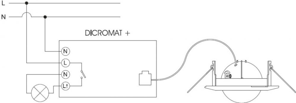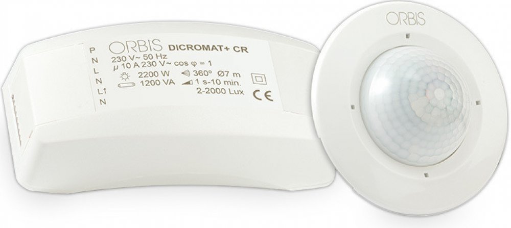 Detektor pohybu, pro zapuštěnou montáž stropu, s úhlem detekce 360 ° a až do průměru detekce 7 m při montáži ve výšce 2,5 m. DICROMAT + CR (s jedním obvodem) je ideální zařízení pro hotely (např. instalace na chodbách) a bytových domech, protože umožňuje spojení senzorů pohybu (až čtyři V DICROMAT + CR), v jediném modulu napájení. To poskytuje větší výkon se snížení nákupní hodnotou zařízení, se souvisejícími ekonomickými úsporami. Hlavním novým prvkem v tomto produktu je, že obsahuje MANDO CR (dálkové ovládání) jednotku, která se používá k naprogramování funkcí v těchto bezdotykových spínačích CR. To poskytuje vynikající rychlost programování, jednoduchost a spolehlivost. Napájení 230V/50Hz, proudové zatížení 10A. Maximální povolené zatížení kontaktů: žárovky - 2200W, nekompenzované zářivky # 1200W , LED lampy # 500W, nízkonapěťové halogenové lampy # 2200VA, halogenové lampy (230 VAC) # 2200W, úsporné zářivky # 1000W. Nastavení intenzity světla 2 # 2000 Lux, časově opožděné vypnutí # 1s. až 10 min.