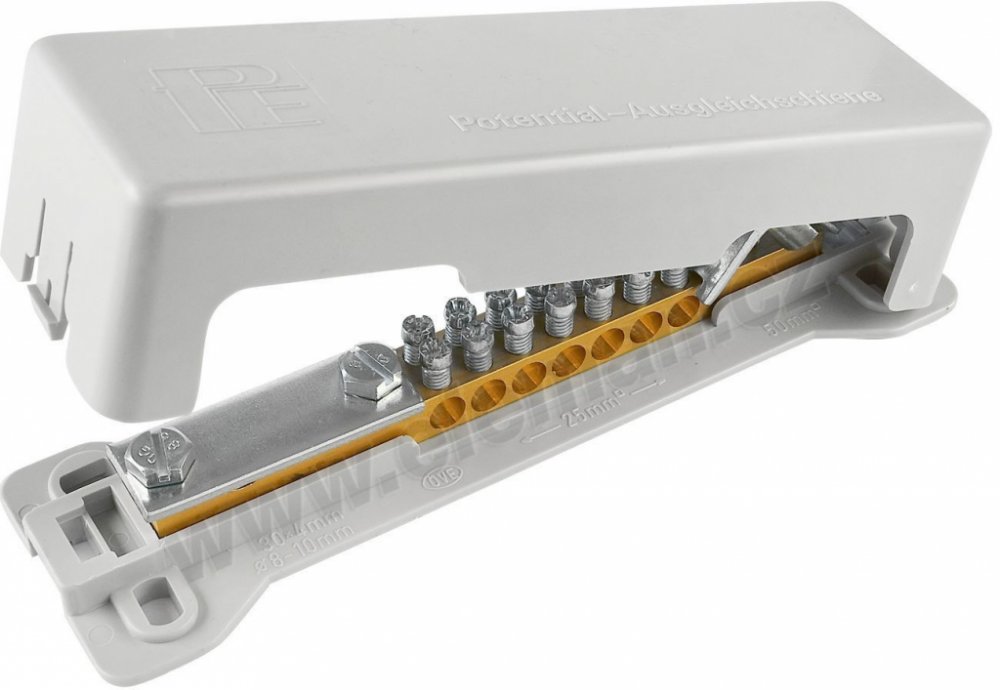 Svorkovnice ekvipotenciální POT 16/25 - krytá svorka, 2-řadá. Připojení páskového zemniče o rozměru 30×4mm, 1x drát 8-10mm, 1x vodič 50mm2, 7x vodič 2,5-25mm2.