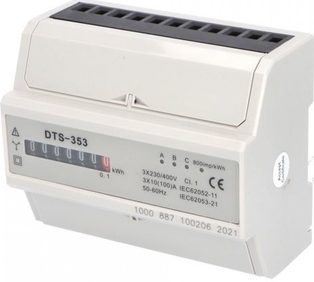 Podružný 3-fázový 1-tarifní mechanický elektroměr pro přímé informativní měření DTS 353-M 100A, 7mod. Třífázový elektroměr s mechanickým displejem pro střídavé napětí 3x230 V / 400 V, 50Hz, slouží k měření činné elektrické energie v přímém zapojení do obvodu. Je určen na podružné měření spotřeby samostatných spotřebičů nebo spotřebičů ve skupinách. Jedná se o přesný elektroměr, který měří již od minimálních hodnot protékajícího proudu (0,5 A) až po 100 A, mechanický displej zobrazuje hodnoty na číselníku od 000000,1 až 999999,9 [kWh], zobrazené naměřené hodnoty nelze vymazat. Indikační LED blikají při odběru konkrétní fáze. Elektroměr má impulzní výstup na svorkách (9) S0+ a (8) S0-. To umožňuje připojení externího zařízení, které počítá impulzy (S0 dle normy DIN 43864) generované elektroměrem. Ke správné funkci elektroměru se nevyžaduje zapojení tohoto doplňkového zařízení. Montuje se na nosnou lištu 35 mm (DIN lištu), vestavná šířka je 122 mm (7 mod.). Šroubové svorky pro pohodlné připojení vodičů až do průřezu 35 mm2. Utahovací moment šroubů : svorka č. 1-7 = 3,0 - 4,0 Nm, svorka č. 8-9 = 1,5 - 2,5 Nm. Vlastní spotřeba je menší než 2 W.