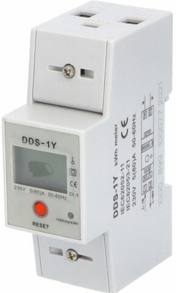 Podružný 1-fázový 1-tarifní digitální elektroměr pro přímé informativní měření DDS-1Y RESET 80A s možností nulování (funkce RESET), 2-modulový, 2-řádkový podsvícený displej.