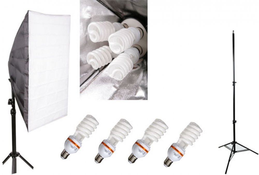 Toto je nejlevnější výkoná 4 žárovková kombinace na českém trhu. Součástí je samotný softbox s držákem 4 žárovek s paticí E27 viz.foto.