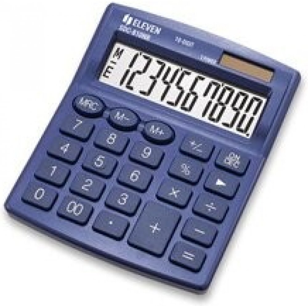 Kompaktní stolní kalkulátor modré barvy se základními funkcemi a mírně nakloněným 10 místným displejem.