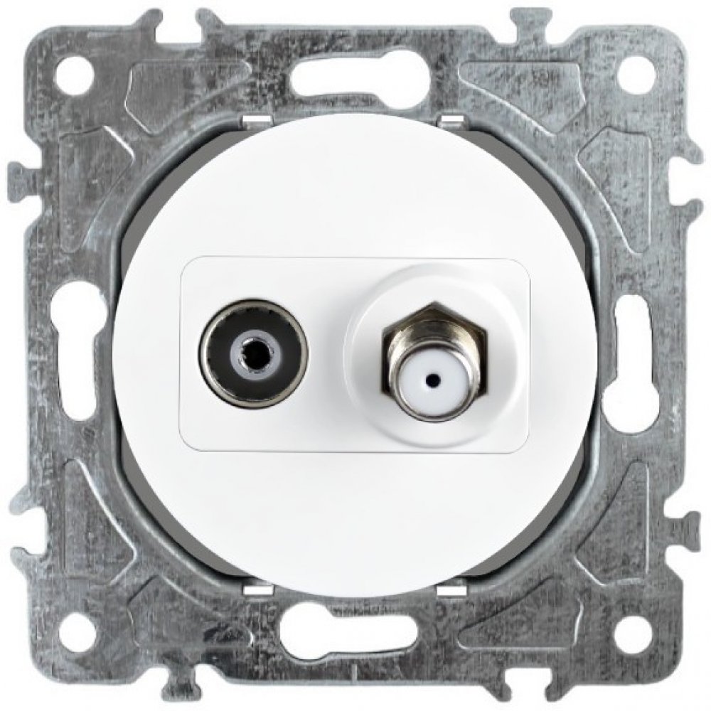Televizní a satelitní zásuvka Elhard RONDO RD2028W v bílé barvě je anténní zásuvka kulatého tvaru pro rozvod TV+SAT signálu. Montáž do elektroinstalační krabice typ 68. Dodává se bez krycího rámečku, možno dokoupit plastový nebo skleněný rámeček RONDO.