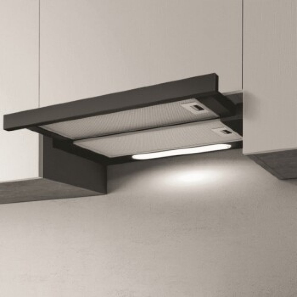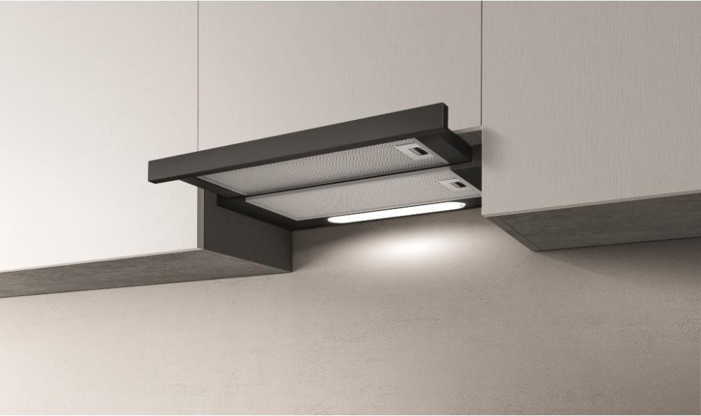 Elegantní a praktický výsuvný odsavač par vyrobený z černého lakovaného kovu. Tento model je ideální pro kuchyně, které kladou důraz na výkon i design. Díky možnosti volby mezi odtahem a recirkulací nabízí flexibilní využití.