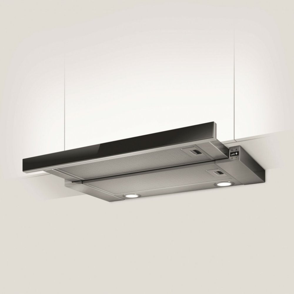 je výsuvný odsavač par (digestoř), je vyroben z nerezové oceli a dekorativní lištou z černého skla. Odsavač par s výkonem 240-480 m3/h a v intenzivním výkonu až 581 m3/h, s hlučností 44-65 db (A).