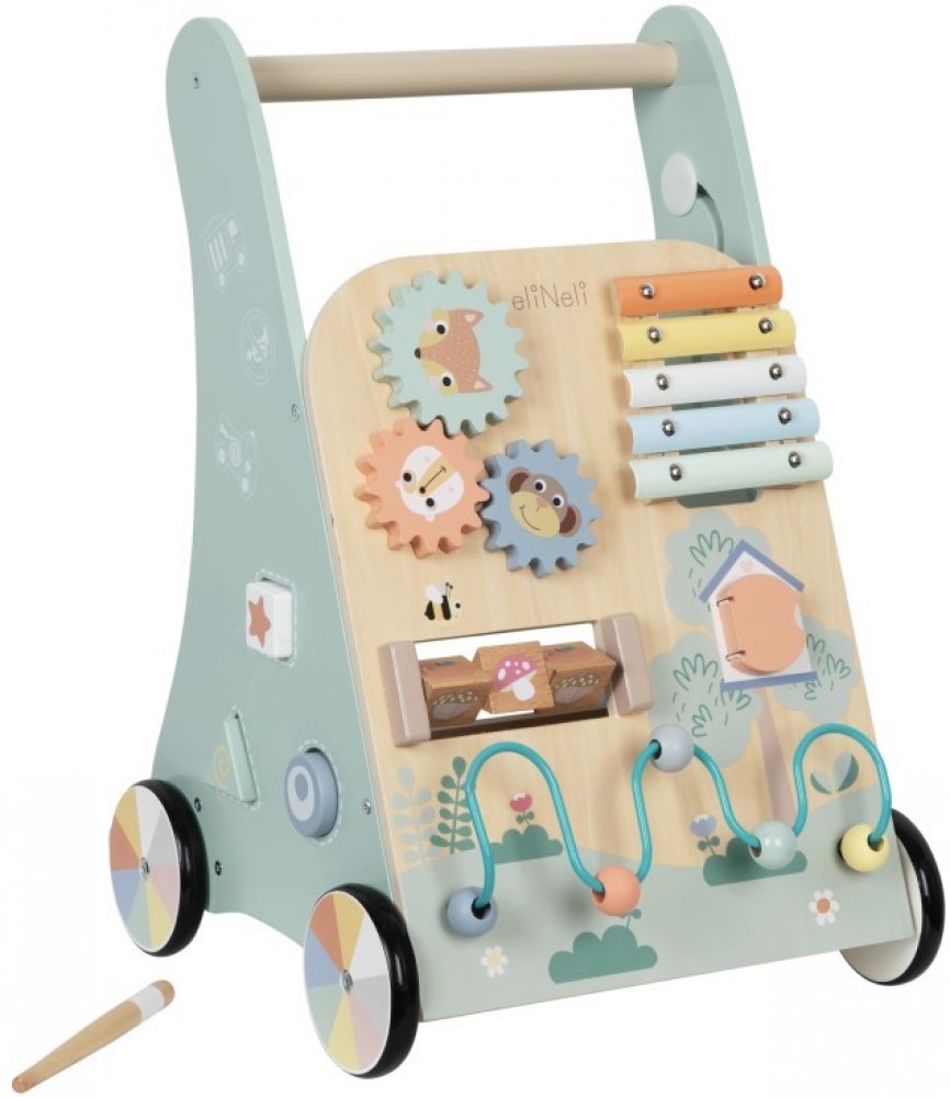 Dřevěné chodítko pro děti v jemných pastelových barvách, se zvířátky a přírodními motivy, nadchne každé dítko. Chodítko pomůže dětem se samostatnou chůzí a s přesunem z dětského pokoje třeba do kuchyně za maminkou. Spolu s chodítkem nepřesunou děti jen sebe, ale rovnou i zábavnou hračkou se spoustou hracích prvků. Na jedené z bočních stran čeká na děti vkládačka se 3 vkládacími tvary, na druhé originální dráha se sanitkou a dalšími dřevěnými autíčky. S hracími prvky na přední straně potrénují děti jemnou motoriku, koordinaci očí a rukou, logické myšlení, kreativitu a ještě si zahrají na hudební nástroj v podobě xylofonu.