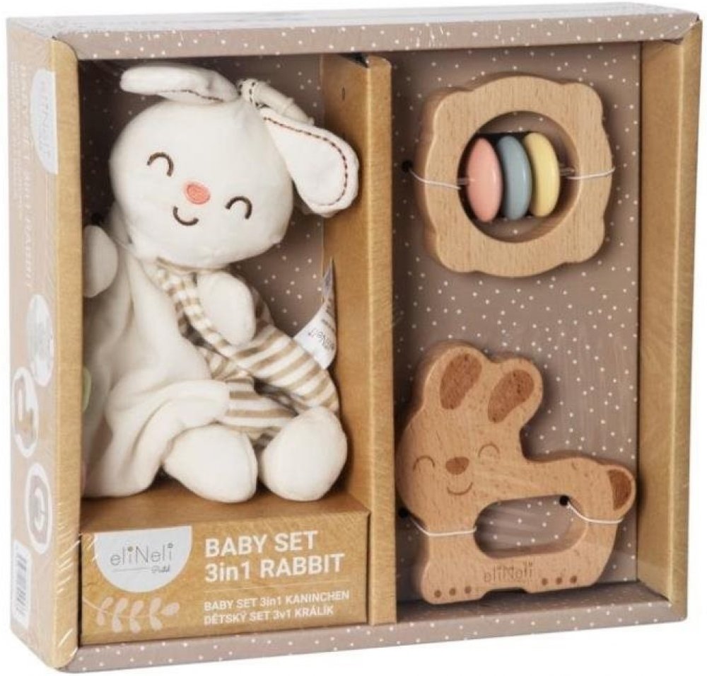 Chrastítko eliNeli obsahuje tři hračky vhodné pro děti od narození – hebkého muchláčka (usínáčka) v podobě králíčka, dřevěné chrastítko a hračku s motivem králíčka. Bylo vyrobeno z bukového dřeva a polyesteru. Set podporuje rozvoj jemné motoriky, úchopu, koordinace rukou a očí a stimuluje smysly dítěte. Kromě toho pomáhá dítěti usnout ať je doma nebo na cestách. Chrastítko eliNeli má certifikaci C...