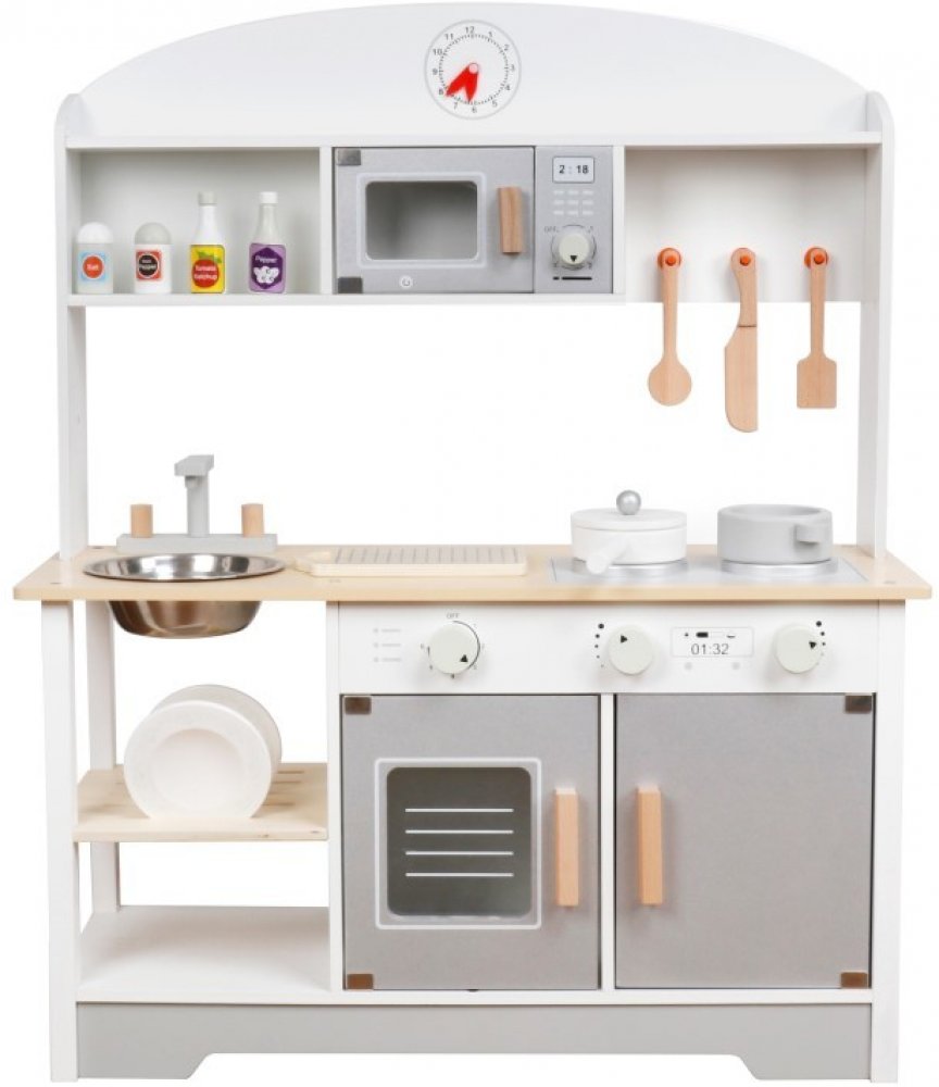 Kvalitní dřevěná kuchyňka pro malé kuchaře a kuchařky v neutrálních barvách je vhodná do každého dětského interiéru. V kuchyňce vybavené nepostradatelnými spotřebiči, jako jsou trouba na pečení, mikrovlnná trouba, sporák s plotýnkami, hodiny, a ve které nechybí ani dřez na umývání špinavého nádobí, se vaše holčička nebo chlapec snadno naučí kuchařskému umění. Pro přípravu chutných pokrmů je dětská kuchyňka dovybavena nádobím i kořením. V dřevěné kuchyňce se při vaření a pečení děti zabaví na celé hodiny a jistě vás překvapí originálními pokrmy, kulinářskými zázraky, odpolední kávičkou nebo snídaní do postele.