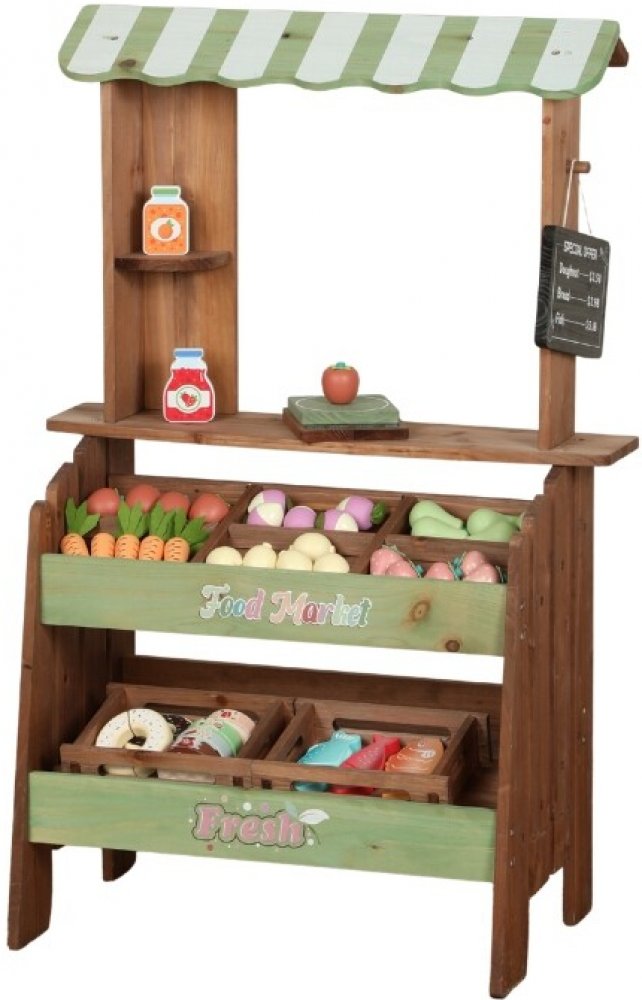 Dřevěný design pro kreativní hruPodporuje jemnou motorikuDětský venkovní prodejní stánek je vyroben z kvalitního masivního dřeva, které zajišťuje stabilitu, odolnost a dlouhou životnost i při pravidelném používání venku. Pevná konstrukce poskytuje bezpečné zázemí pro hru na obchod a podporuje přirozené zapojení dětí do hraní rolí.Bohaté příslušenství zahrnuje ovoce a zeleninu, marmelády, zákusky i...
