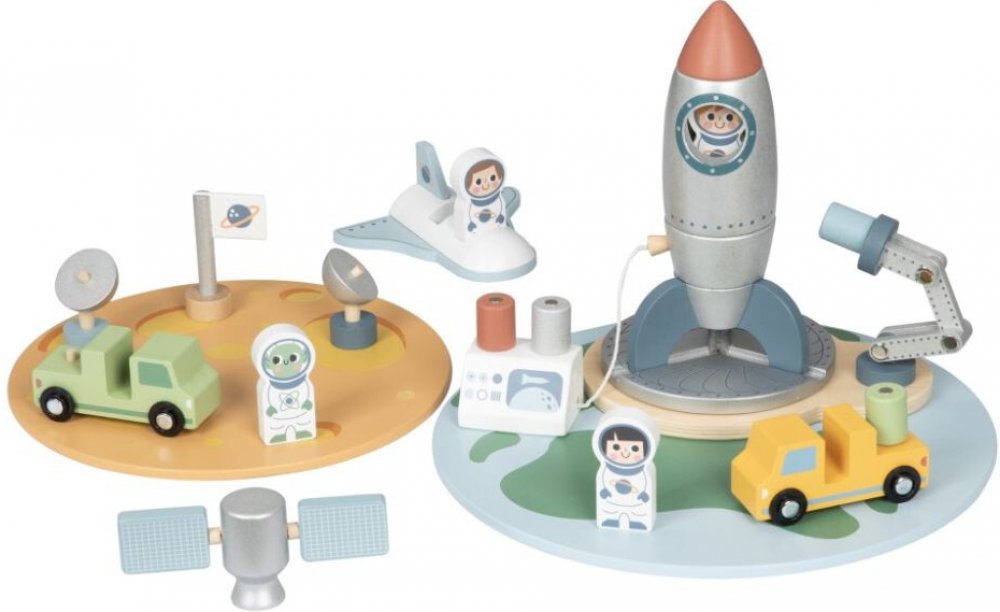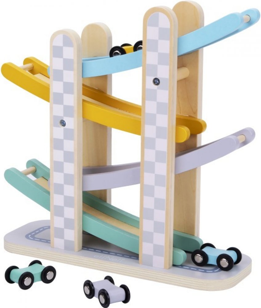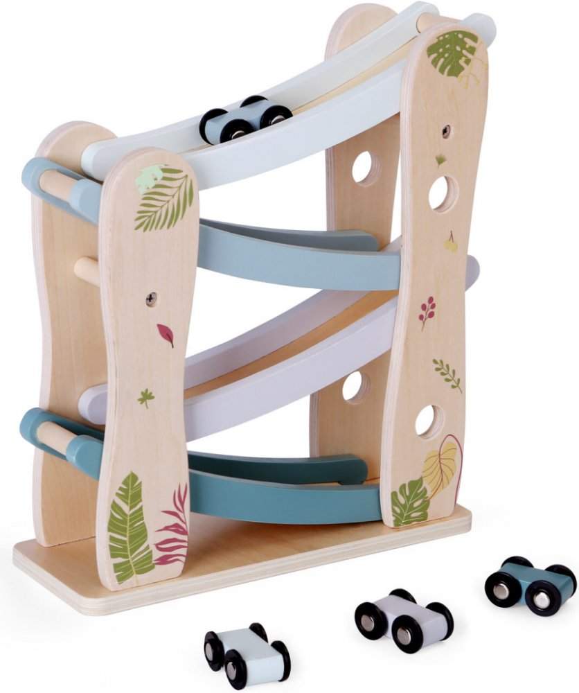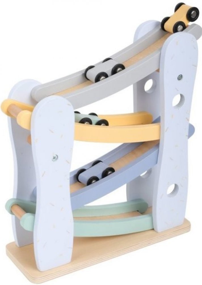 Dřevěná autodráha se skládá ze čtyř úrovní a každá má jinou barvu. Konstrukce dráhy i karoserie barevných autíček jsou vyrobeny ze dřeva.