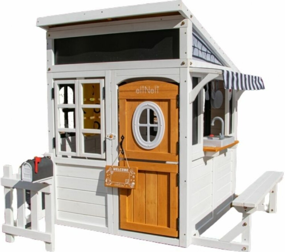 Moderní design a šikmá střechaStylový vzhled pro každou zahraduDětský dřevěný zahradní domek zaujme moderní šikmou střechou, která mu dodává elegantní a nadčasový vzhled. Díky čistým liniím se přirozeně začlení do každé zahrady a vytvoří atraktivní prostor pro dětskou hru.Šikmá střecha není jen estetickým prvkem, ale také praktickým řešením – zajišťuje účinný odvod dešťové vody a přispívá k delší životnosti domku. Děti si tak mohou užívat hru v suchém a komfortním prostředí.Interaktivní prvky pro nápadité hraníPodpora kreativity a učeníDomek nabízí prodejní okno s pruhovanou markýzou, které dětem umožňuje hrát si na obchodníky a rozvíjet tak svou představivost i sociální dovednosti.Součástí jsou také dlouhé popisné tabule vhodné pro kreslení a psaní, díky kterým si děti mohou vytvářet vlastní příběhy a učit se novým věcem na čerstvém vzduchu.Bezpečné a praktické dveře a oknaSnadný přístup a bezpečnostDomek je vybaven holandskými dveřmi, které umožňují snadný přístup a zároveň zajišťují bezpečnost dětí. Dveře jsou navrženy tak, aby se snadno otevíraly a zavíraly.Magnetická dřevěná okna dodávají domku autentický vzhled a zároveň umožňují dětem snadno komunikovat s okolím. Okna jsou bezpečná a odolná vůči povětrnostním vlivům.Vestavěná lavička a poštovní schránkaKomfort a zábava v jednomSoučástí domku je vestavěná lavička, která dětem poskytuje pohodlné místo k odpočinku nebo hře. Lavička je pevná, odolná a vhodná pro venkovní použití.Oplocená poštovní schránka přidává zábavný interaktivní prvek – děti si mohou hrát na pošťáky a rozvíjet fantazii při doručování dopisů a balíčků. Domácí mazlíčci jistě ocení svůj privátní vstup.Technické parametryPočet dílů98 ksRozměry144,2 x 184,2 x 144,3 cmRozměry balení43 x 56,5 x 111,5 cmHmotnost41,7 kgHmotnost balení47,5 kgMateriáljedleCertifikátyEN 71-1,2,3, EN IEC 62115Doporučený věkod 3 let, 36m+Snadná montáž a údržbaRychlá instalace a dlouhá životnostDomek je navržen pro snadnou montáž s přehledně označenými díly a srozumitelným návodem, díky čemuž je hotový během několika hodin.Použitá jedle je odolná vůči povětrnostním vlivům. Výhody produktu Moderní design Šikmá střecha a elegantní vzhled dodávají domku styl, který se hodí do každé zahrady. Interaktivní prvky Prodejní okno, otočné válce a popisná tabule podporují kreativitu a rozvíjejí sociální dovednosti dětí. Bezpečné dveře a okna Holandské dveře a magnetická okna zajišťují bezpečnost a snadný přístup. Komfortní lavička Vestavěná lavička poskytuje pohodlné místo k odpočinku a hře. Zábavná poštovní schránka Oplocená schránka přidává domku další zábavný prvek pro hru na pošťáky. Snadná montáž Rychlá a jednoduchá instalace díky přesně označeným dílům a srozumitelnému návodu. My v ELIS DESIGN jsme sami rodiče dětí různého věku a záleží nám na tom, s čím si hrají. Proto i pro vaše děti vytváříme a vybíráme smysluplné hračky z kvalitních, nejlépe přírodních, materiálů, inspirované montessori, které nejen zabaví, ale i rozvíjí. Je domek vhodný pro děti mladší 3 let? Domek je doporučen pro děti od 3 let. Je montáž domku složitá? Montáž není obtížná. Všechny díly jsou označeny a návod je srozumitelný. Jaké jsou rozměry domku? Rozměry domku jsou 144,2 x 184,2 x 144,3 cm. Je dostatečně prostorný pro hru více dětí. Více o produktech eliNeli https://www.elineli.eu/cz/