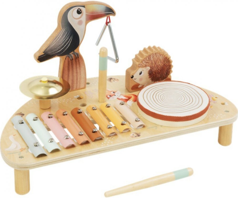 Hudební stolek se sadou hudebních nástrojů okouzlí každou holčičku i chlapce svým designem, barvami i motivem roztomilých zvířátek. Originální hudební stoleček probudí lásku k hudbě v každém dítku. Stoleček s hudebními nástroji přinese radost do každého dětského pokoje a hned tak děti neomrzí - hrát totiž mohou hned na několik hudebních nástrojů. Najdou tu xylofon, činel, bubínek, triangl nebo dřívka (paličky). Oblíbené hudební nástroje na jednom místě umožní dětem uspořádat malý koncert pro své panenky, plyšáky, rodiče nebo kamarády. Děti se seznámí s hudebními nástroji, s tím, jak se na ně hraje a jaké zvuky vydávají, stimulují své smysly, zdokonalují jemnou motoriku, hrají role, rozvíjejí fantazii.