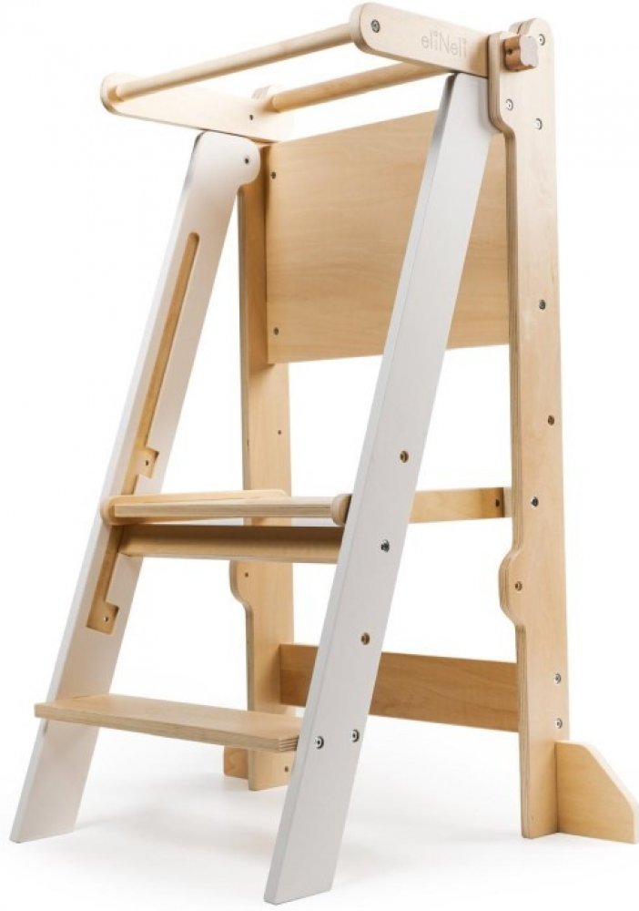 Rostoucí učicí věž 2v1 eliNeli je praktická pomůcka pro malé šikulky v podobě schůdků, které doplňuje kreslicí tabule. Je navržena podle Montessori principů, podporujících samostatnost v poznávání a osobním rozvoji. Skládací věž s rostoucí funkcí lze přizpůsobit díky výškově nastavitelné plošině do 3 úrovní, a to pro děti již od 1 roku. Je vyrobena ze dřeva a ošetřena transparentním lakem i bílou barvou. Lze ji jednoduše složit, proto nezabírá moc místa. Díky věži mohou malí neposedové dosáhnout třeba na kuchyňskou linku a pomáhat mamince při vaření. Z vyšší polohy se jim otevírá nový svět, kde mohou bezpečně pozorovat, zkoumat, objevovat, zkoušet, zdokonalovat své dovednosti a učit se novým věcem. Na zadní části věže je umístěna černá kreslicí tabule, kde si dítko může kreslit křídami obrázky podle vlastní fantazie. Děti si zdokonalí motorické dovednosti, manuální zručnost, logické myšlení, rozvíjí kreativitu a fantazii. Klíčové vlastnosti učicí...