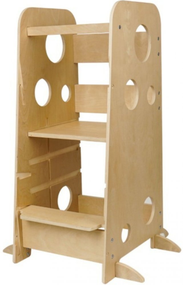 Pevnost a stabilitu učící věži dodává použitý kvalitní dřevěný a spojovací materiál. Předchystané drážky umožní snadnou proměnu z učicí věže na dětský stůl se židličkou, výškově nastavit plošinku i multifunkční schodek (schodek a zarážka).