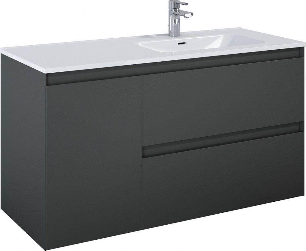 - výška: 63,5 cm - šířka: 120 cm - hloubka: 45,8 cm - skládá se ze skříňky 80 cm a komody 40 cm s nákladním košem na levé straně - se 2 zásuvkami s kovovými boky, s plným výsuvem a systémem tichého dovírání - nákladní koš v komodě má výsuvy s nosností až 20 kg, s plným výsuvem a systémem tichého zavírání - čelo a korpus z lakované laminované desky - frézované úchyty profilované pod úhlem 45°. - lze kombinovat s pracovními deskami ElitStone - barva antracit matná Cena je uvedena za skříňku bez umyvadla.
