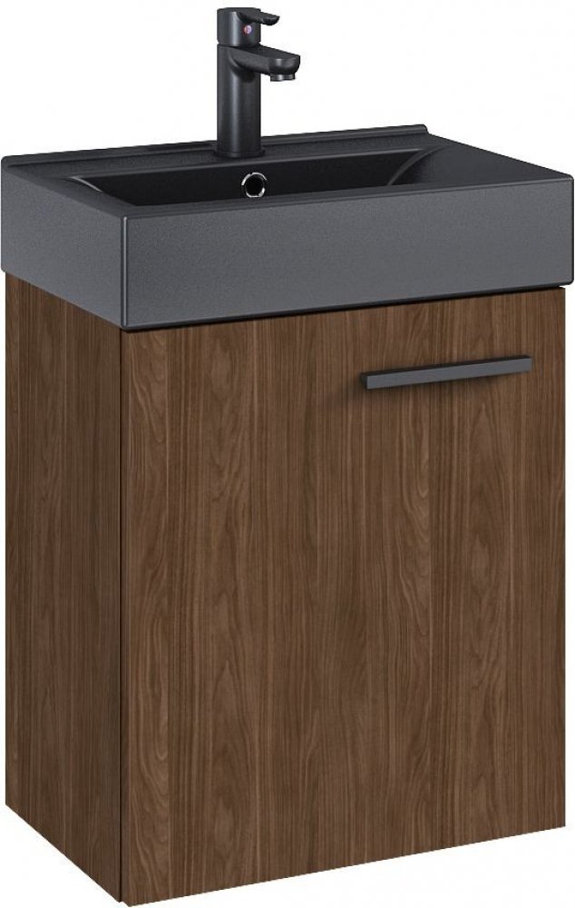 Tiny - měkkost a lehkost v koupelně. Sada Tiny přirozeně zapadá do minimalistického stylu, kterému dominují rovné linie a geometrické tvary. Jemné úchytky dodávají nábytku šarm a podtrhují jeho barevnost. - smontovaný výrobek - barva: ořech lincoln - přední strana a korpus z laminované desky o tloušťce 16 mm - panty s tichým zavíráním - úchytka z hliníku, matná antracitová barva - nastavitelná vnitřní police - univerzální dvířka - keramické umyvadlo TINY, antracit matný