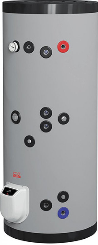 Stacionární, na zemi stojící, solární ohřívač vody o objemu 500 litrů s elektrickým ohřevem. Ohřívač je vybaven dvěma topnými hady na připojení solárního systému a kotle ÚT.