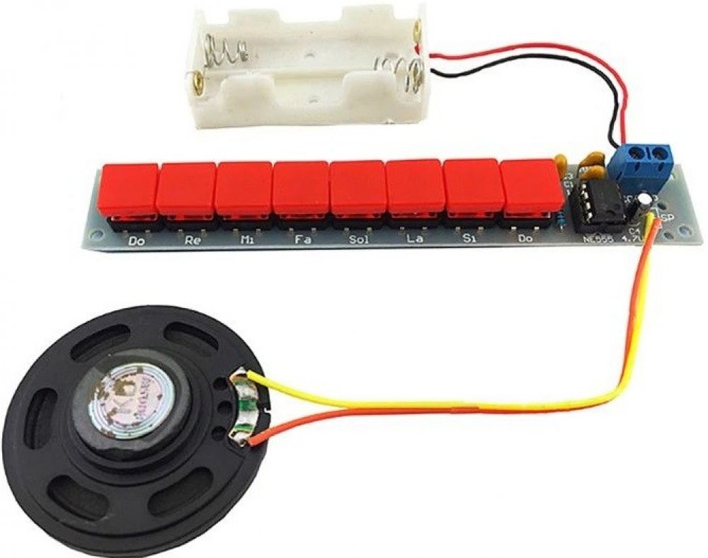S touto stavebnicí postavíte jednoduchý elektrický obvod, který produkuje různé zvuky. Každé tlačítko odpovídá jinému tónu. Na elektronickém piánu můžete hrát melodie, podobně jako na běžném piáně. Základním stavebním prvkem obvodu je časovač 555, připojený k oscilátoru. Frekvence oscilátoru je určena velikostí odporu v obvodu (R1-R10), který se mění v závislosti na stisknutém tlačítku.