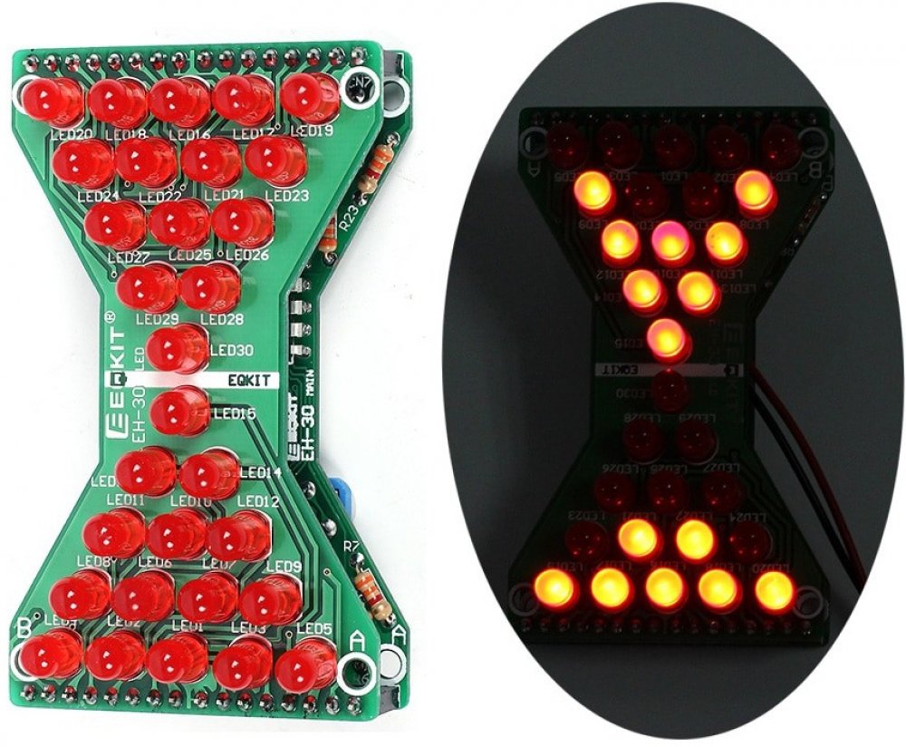 S touto stavebnicí postavíte elektronické přesýpací hodiny, simulující přesýpání písku. Není to jen stavebnice pro trénování pájení, ale zároveň zlepšíte své elektronické znalosti. V neposlední řadě je to i plně funkční časovač, jehož rychlost je možné upravit trimerem a používat jej např. při vaření nebo čištění zubů.