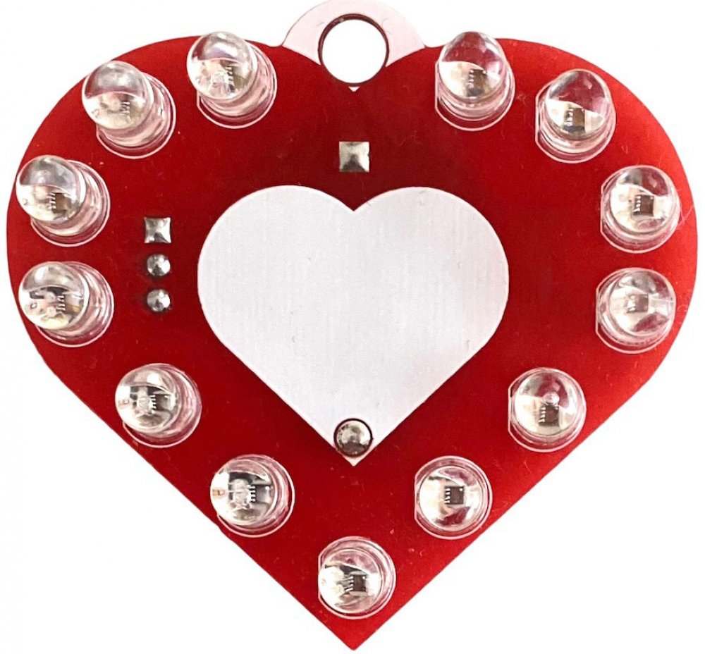 Jedná se o velmi jednoduchý obvod, který je vhodný pro seznámení s pájením součástek na plošný spoj. Diody na srdíčku automaticky mění barvy. Srdíčko má malý otvor, kterým je možné protáhnout provázek a výrobek zavěsit.