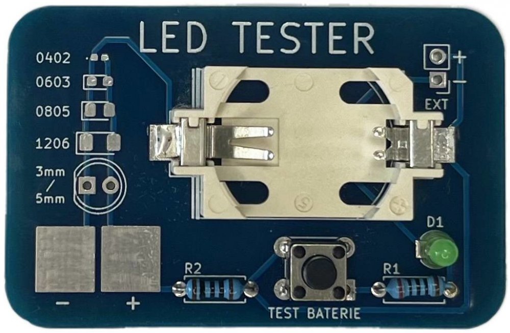 Tato stavebnice LED testeru, slouží k testování různých typů LED diod. Přiložením LED diody na testovací plošku si můžete ověřit její funkčnost. Vhodné pro rychlé ověření barevnosti led diody. Pro testování SMD LED diod je potřeba lehce přimáčknout diodu, aby bylo možné ověřit její funkčnost.