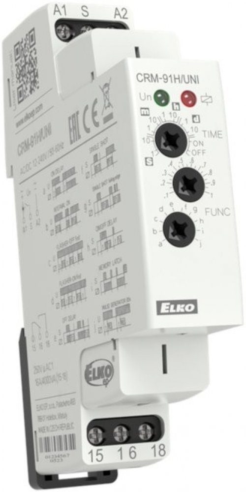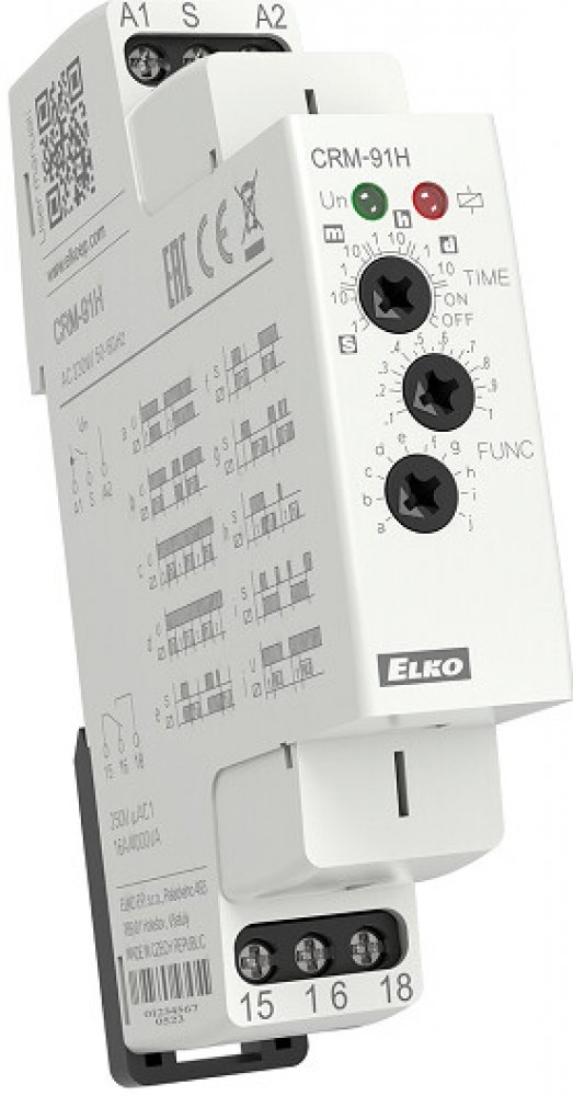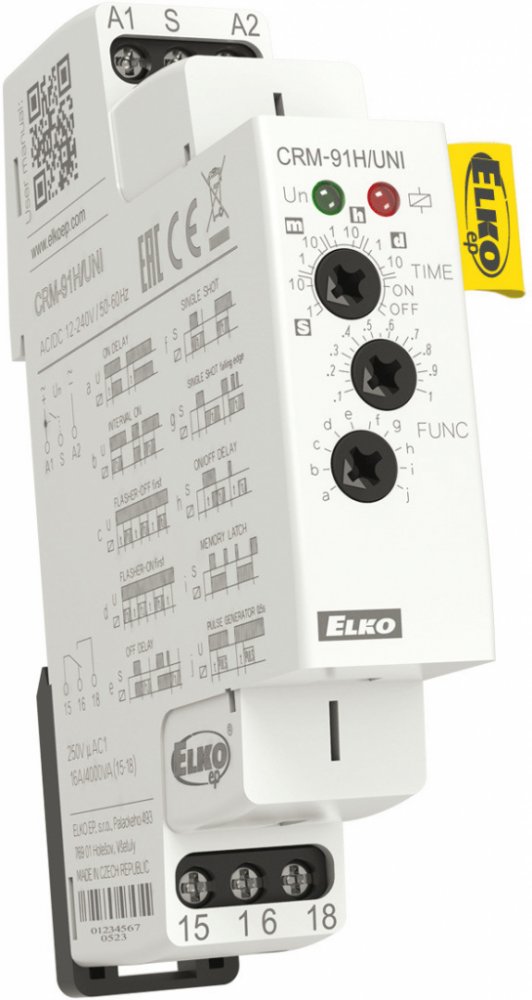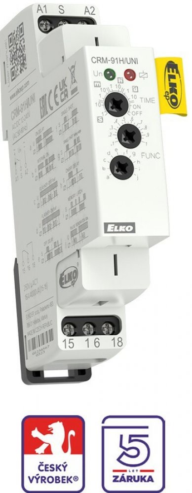 multifunkční časové relé pro univerzální využití v automatizaci, řízení a regulaci nebo v domovních instalacíchdíky své bohaté výbavě (10 funkcí, 10 časových rozsahů, UNIverzálnímu napájení, 16A nebo 3x8A kontaktu) pokrývá veškeré požadavky, které mohou být na časové relé kladeny10 funkcí- 5 časových funkcí ovládaných napájecím napětím- 4 časové funkce ovládané ovládacím vstupem- 1 funkce paměťového (impulsního) relékomfortní a přehledné nastavování funkcí a časových rozsahů se provádí otočnými přepínačinastavitelný čas od 0.1 s do 10 dní je rozdělěn od 10-ti rozsahů:(0.1 s - 1 s / 1 s - 10 s / 0.1 min - 1 min / 1 min - 10 min / 0.1 h - 1 h / 1 h - 10 h / 0.1 dne - 1 den / 1 den - 10 dní / pouze ON / pouze OFF)CRM-91H:- napájecí napětí: AC/DC 12 - 240 V- výstupní kontakt: CRM-91H: 1x přepínací 16 Astav výstupu indikuje multifunkční červená LED, která bliká nebo svítí v závislosti na stavu výstupuv provedení 1-MODUL, upevnění na DIN lištu