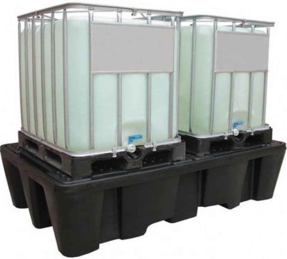Záchytné vany pod dva IBC kontejnery se postarají o bezpečné zachycení případných úniků látek při skladování nebo výdeji z IBC kontejneru. Vyjímatelný rošt zajišťuje pohodlné vyprazdňování a čištění. Objem záchytné vany 1100 l. Nosnost 3.000 Kg
