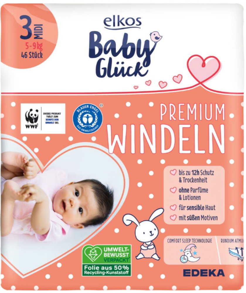 Elkos Baby plenky Premium Midi (5-9 kg) 46 ks jsou kvalitní německé dětské plenky pro děti od 5 do 9 kg. Vysoký komfort při nošení. Bezpečná ochrana proti úniku tekutiny. Široké, flexibilní elastické manžety. Hravé motivy. Dokonalá ochrana po celý den i noc - prodyšné, jemné k pokožce, měkké.