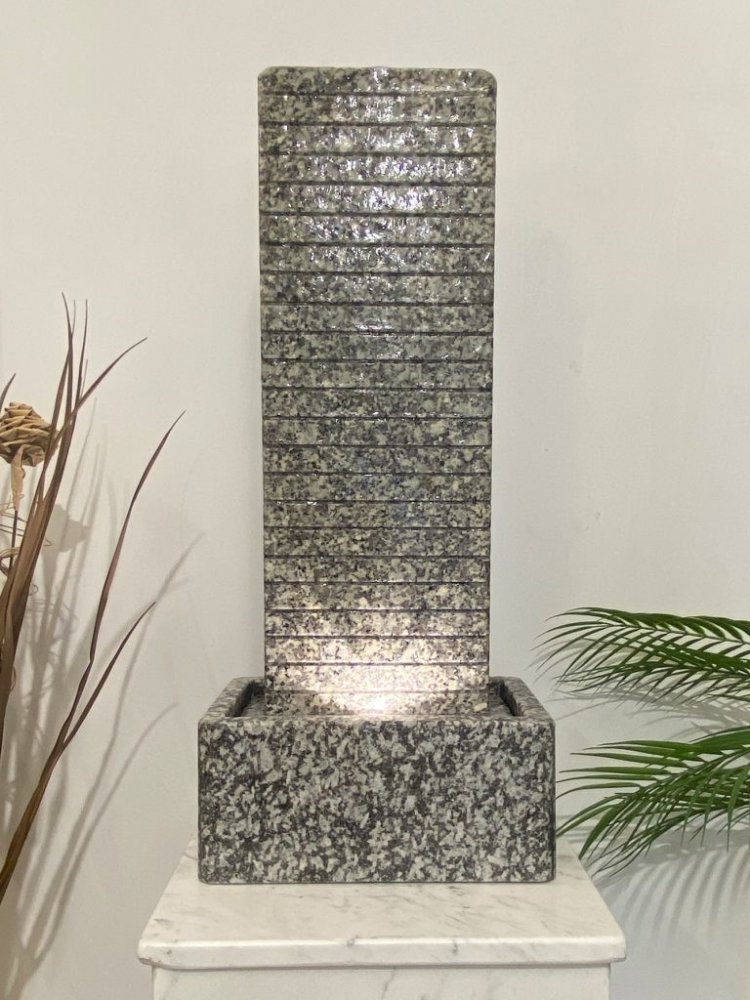 Tato fontána se skládá ze dvou částí: vodní stěny nalepené na základní desce, po které voda jemně stéká dolů, a vany z leštěného deskového materiálu, která slouží jako zásobník vody. V bazénu je umístěna tichá kvalitní pumpa a halogenové osvětlení (s páčkovým vypínačem na kabelu), které svítí otvorem v základové desce nahoru a úžasně zvýrazňuje vodu stékající po drážkované desce.