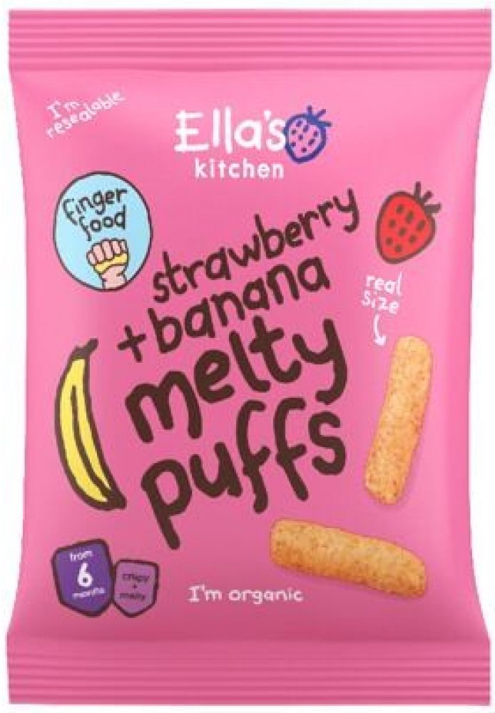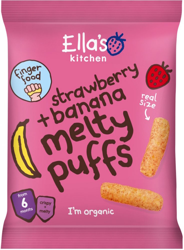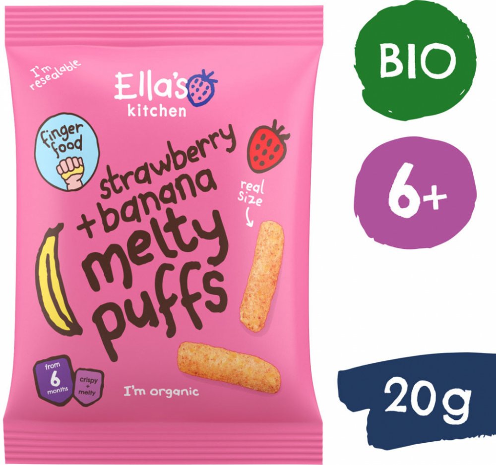 Tyto křupky skvěle padnou do dětské ručičky, takže se s nimi budou rády krmit samy. Kromě toho, že si smlsnou a polaskají chuťové pohárky jahodami a banánem, procvičí si hravě i jemnou motoriku a zlepší koordinaci oko-ruka. Natáhnout prstíky, uchopit a… šup do pusy! Mlsat je můžou děti už od šesti měsíců a mlsat je můžou bez výčitek – neobsahují totiž žádné přidané cukry, sůl ani umělá barviva. Hlavní vlastnosti BIO kvalita bez přidaného cukru a soli, bez umělých barviv a konzervantů, bez laktózy. Tvar přizpůsobený dětskému úchopu. Složení: BIO kukuřičná mouka 75 %, BIO slunečnicový olej 13 %, BIO sušené banány 8 %, BIO sušené jahody 3 %, BIO sušené maliny