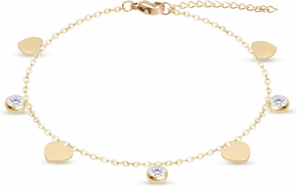Řetízek na nohu z chirurgické oceli, pozlacený 14k, srdce se zirkony.