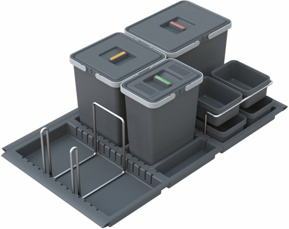 Unikátní modulární systém košů Metropolis je určen přímo do zásuvek kuchyňských linek. Je lehce sestavitelný a dostupný ve dvou výškách ( 22 a 28 cm) a třech šířkách (51, 81 a 111 cm). Pomocí flexibilního těsnění vykompenzujete různé rozměry vaší zásuvky. Lze doplnit příslušenstvím z chromovaného drátu ( držák na prací prostředky,držák táců, držák papíru ). Všechny koše mají víko proti zápachu a jedno víko je osazeno filtrem proti zápachu. Děliče přepážek můžete přemísťovat a a měnit si dle svého přáni umístění jednotlivých nádob. Součástí balení jsou také barevné samolepy, díky kterým si označíte jednotlivé nádoby na třídění odpadu. Vestavný odpadkový koš Metropolis PTC28 09050 3F pro montáž do výsuvných zásuvek kuchyňských linek Sami si podle velikosti své výsuvné zásuvky zvolíte, kolik odpadkových nádob a jakého objemu potřebujete ve své kuchyni. Modulární systém snadno sestavíte za pár minut a budete překvapeni, jak je celý systém variabilní. A celou sestavu košů pak můžete doplnit v rámci příslušenství o různé držáky a praktické plastové misky. Se sestavou košů Metropolis získáte kvalitní systém na třídění odpadu. Jak výsuvné odpadkové koše Metropolis fungují? Všechny koše jsou umístěny v plastových flexibilních miskách a pomocí děličů je každý koš zaaretován ve své správné poloze. Plastové misky jsou pouze položeny na dně vysouvací zásuvky. Při vytažení zásuvky je tak ke každé nádobě dobrý přístup a to nejen při ukládání odpadu, ale také při výměně plného sáčku na odpad či vyjmutí celé nádoby mimo zásuvku Jak vám výsuvné odpadkové koše Metropolis usnadní třídění odpadu? Získáte prostor pro třídění až 4 druhů odpadu. Nádoby maji objem 6 až 15 litrů. Každý koš je vybaven víkem a vždy jedno víko je ještě osazeno filtrem proti zápachu. Filtr proti zápachu lze prát či vyměnit za nový. Přiloženými samolepkami pak lze každé víko barevně odlišit, aby jste vždy věděli, kam který odpad uložit Každý koš lze rozdělit na dva Plastové odpadkové nádoby mají na horní straně výřez, pomocí kterého lze do jedné nádoby umístit dva sáčky a tím si rozšířit počet druhů tříděného odpadu. Tuto funkci doporučujeme hlavně u větších nádob ( 12 a 15 litrů ) Snadná změna velikosti jednotlivých nádob Celý systém je modulární a pokud v budoucnu zjistíte, že vám stávající sestava košů nevyhovuje, můžete si dokoupit jiné velikosti košů a vík. Pouze přesunutím děliče vytvoříte v plastové základně prostor pro jiný koš. Všechny koše maji rukojeti, které slouží nejen k manipulaci s košem, ale k upevnění sáčku na odpad na horním okraji koše. Příslušenství k produktové řadě Metropolis Typovou řadu košů Metropolis lze rozšířit o různé chromované drátěné držáky nebo stojany plastových misek, které lze například použít pro čistící prostředky či třeba tablety do myčky. Umístění těchto předmětů v blízkosti košů je praktické a také se vyhnete stavu, kdy tyto chemické prostředky jsou v blízkosti potravin Ke každému koši víko Ke každému koši obdržíte víko a vždy jedno víko v celé sestavě je osazeno filtrem proti zápachu. Filtry lze buď měnit nebo je možné ho až 50 x vyprat. Koš je zkonstruován tak, aby i při použití víka byly rukojeti funkční a veškerá možná manipulace s košem byla možná při příklopeném víku Další výhody, ze kterých budete mít radost celý systém je uvnitř skříňky a odpadkové koše nebudou nikde překážet velice jednoduchá a snadná údržba velice jednoduché na montáž - zvládnete svépomocí za pár minut možnost doplnění o další nádoby barevné rozlišení vík nádob podle jednotlivých druhů odpadu vyrobeno z kvalitního recyklovatelného materiálu možnost třídění odpadu na jednom místě moderní design vhodný do všech kuchyní Parametry výrobku PTC28 09050 3F