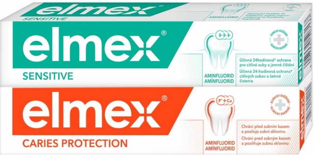 V duo balení naleznete zubní pastu Elmex Caries Protection 75 ml + Elmex Sensitive 75 ml