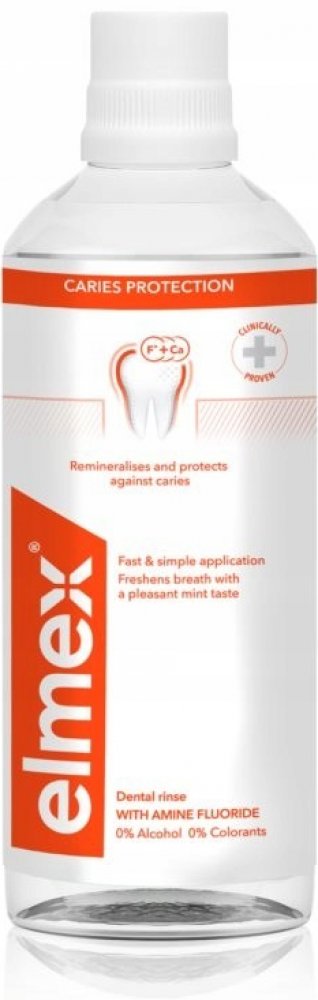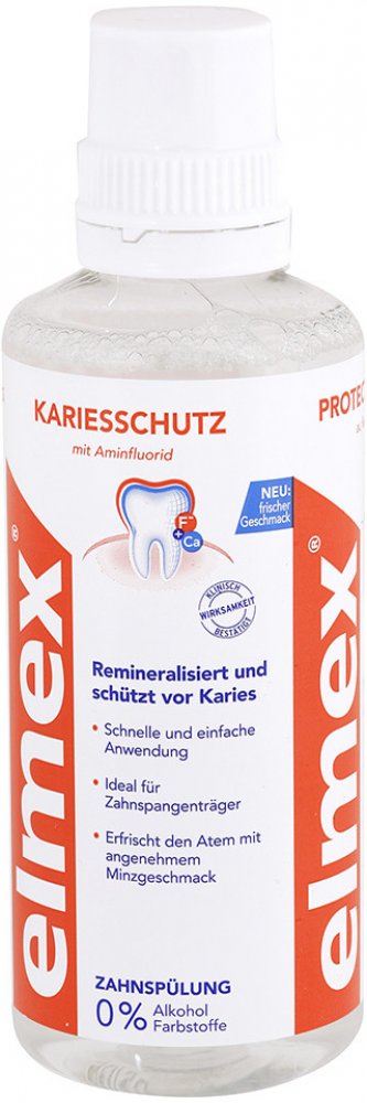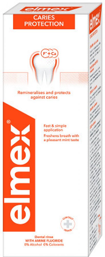 Vysoce účinné aminfluoridové složení elmex® vytváří ochrannou vrstvu fluoridu vápenatého s dvojím účinkem, která remineralizuje zuby a účinně je chrání před zubním kazem. Jedná se o jednu z mála ústních vod bez obsahu alkoholu a barviv.