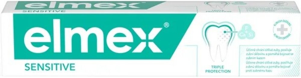 Zubní pasta Elmex SENSITIVE bylaspeciálně vyvinuta pro ochranu obnažených zubních krčků. Obsahuje vysoce účinný aminfluorid, který na povrchu dentinu vytváří ochrannou vrstvu a eliminuje tak bolest způsobenou vnějšími podněty. Tento účinek je dále posílen obsahem speciálních čisticích látek. Díky nim zubní pasta elmex SENSITIVE čistí zuby šetrně, aniž by docházelo k abrazi (obrušování) skloviny a dentinu. Aminfluorid také chrání krčky zubů před zubním kazem. Zubní pasta elmex SENSITIVE , používaná společně s ústní vodou elmex SENSITIVE, vytváří systém na ochranu obnažených zubních krčků. Účinek systému je účinnější než u každého výrobku zvlášť. Strom zbavený kůry je obzvláště zranitelný vůči vnějším podnětům. Přesně tak je tomu i u zubů. Pokud jsou krčky zubů obnažené, hrozí riziko vzniku zubního kazu této části zubů. ELMEX SENSITIVE ZUBNÍ PASTATrojitý účinek a klinicky ověřená ochranaV důsledku ústupu dásní jsou citlivé zubní krčky obnažené. V důsledku toho mohou vnější podněty, jako je teplo nebo chlad, kyselé nebo sladké potraviny nebo dotyk, způsobit bolest a zvýšit náchylnost zubních krčků ke vzniku zubního kazu. Poskytuje trojnásobně účinný účinek a klinicky ověřenou ochranu hypersenzitivních zubů.Klíčové výhodyObsahuje aminfluorid, který postupně posiluje zuby a chrání před zubním kazem.Chrání citlivé zuby po celý den při pravidelném čištění 2x denně.Jemně čistí díky obsahu jemných částic.Jemně odstraňuje bakteriální plak.Klinicky testovaný výrobek.Doporučeno zubními lékaři.Klinicky ověřená účinnost proti citlivosti zubů.Četné klinické studie potvrdily vysokou účinnost aminfluoridu. Vytváří dlouhotrvající ochranný film kolem obnažených zubních krčků, čímž zabraňuje citlivosti zubů a vzniku zubního kazu. Zubní pasta Elmex SENSITIVE byla speciálně vyvinuta pro ochranu obnažených zubních krčků. Obsahuje vysoce účinný aminfluorid, který na povrchu dentinu vytváří ochrannou vrstvu a eliminuje tak bolest způsobenou vnějšími podněty. Tento účinek je dále posílen obsahem speciálních čisticích látek. Díky nim zubní pasta elmex SENSITIVE čistí zuby šetrně, aniž by docházelo k abrazi (obrušování) skloviny a dentinu. Aminfluorid také chrání krčky zubů před zubním kazem. Zubní pasta elmex SENSITIVE , používaná společně s ústní vodou elmex SENSITIVE, vytváří systém na ochranu obnažených zubních krčků. Účinek systému je účinnější než u každého výrobku zvlášť. Strom zbavený kůry je obzvláště zranitelný vůči vnějším podnětům. Přesně tak je tomu i u zubů. Když jsou krčky zubů obnažené, hrozí riziko vzniku zubního kazu této části zubů. Speciální zubní pasta pro citlivé zuby Elmex Sensitive Care 75 ml je klinicky ověřeným řešením pro ty, kteří trpí citlivostí zubů. Díky své jedinečné receptuře s aminfluoridem a hydroaktivním komplexem poskytuje účinnou ochranu před bolestivou citlivostí. Tato zubní pasta nejenže pečuje o zuby a dásně, ale také poskytuje dlouhodobou ochranu před podrážděním a nepříjemnými pocity při jídle a pití. S Elmex Sensitive Care si můžete užít každodenní péči o zuby s jistotou a komfortem. Zubní pasta Sensitive Doplněk pro krásu a zdraví