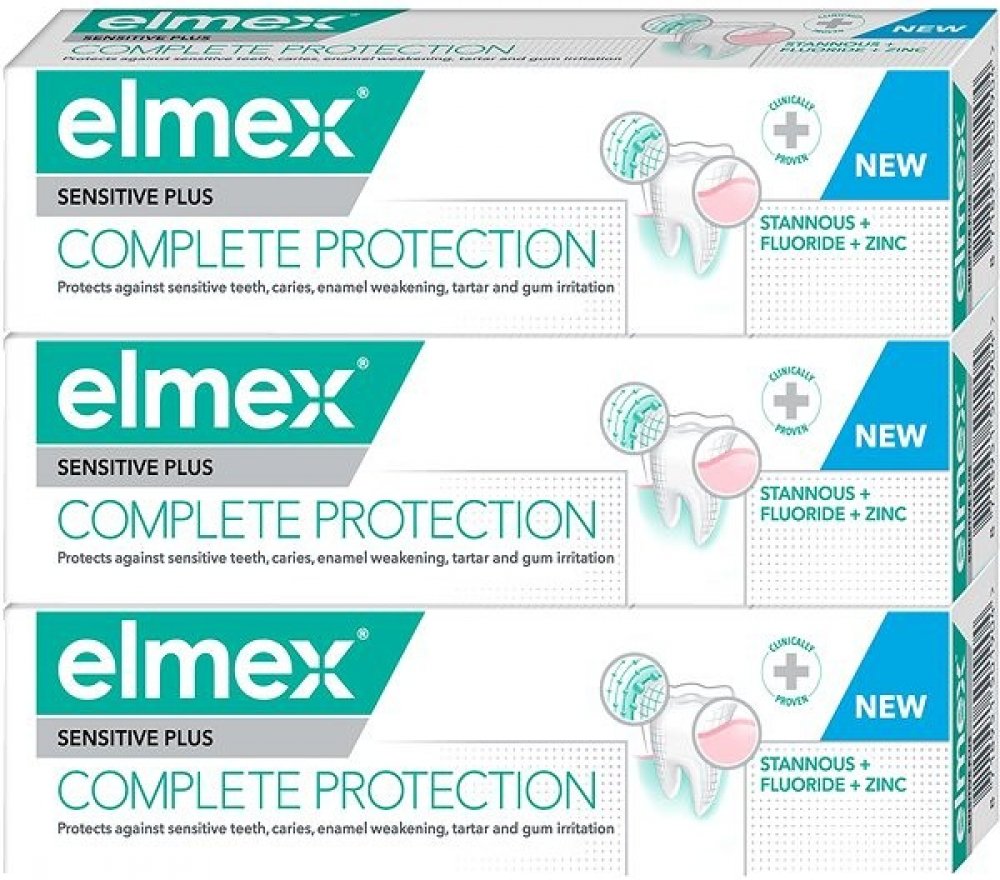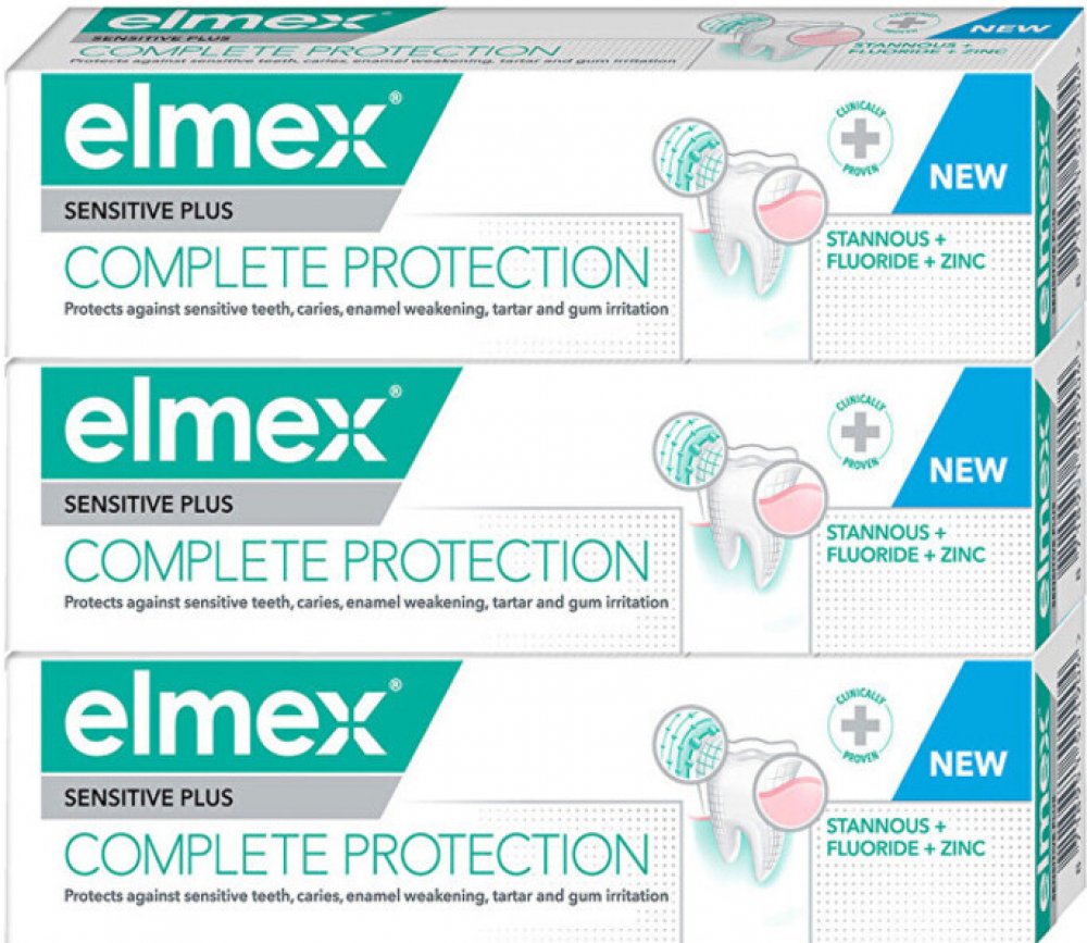 Zubní pasta elmex® Sensitive Plus Complete Protection je zubní pasta pro citlivé zuby s obsahem fluoridu cínatého a fosforečnanu zinečnatého, které poskytují kompletní ochranu pro zdravá ústa.