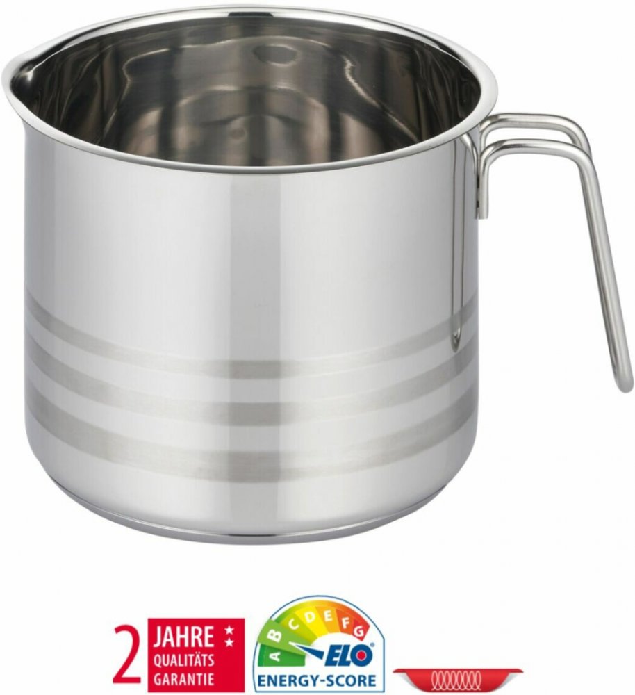 Hrnec ELO BASIC Brillant na mléko je vyrobený z kvalitní nerezové oceli s leštěným povrchem, na kterém jsou z vnější strany tři matné pruhy. Snadné nalévání umožňuje praktická výlevka a bezpečnou manipulaci zajišťuje jedna rukojeť z druhé strany. Uvnitř najdete integrovanou měrnou stupnici, která vám pomůže s přesným dávkováním tekutin. Hrnec disponuje silným sendvičovým dnem, které efektivně rozv...