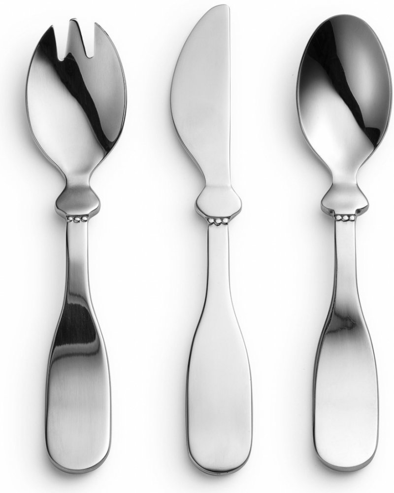 Příbor z nové kolekce EAT je navržen speciálně pro malé dětské ruce. Lžička, vidlička i nůž má starožitný vintage vzhled a moderní anatomický tvar, vhodný pro vygravírování jména dítěte. Příbor lze mýt v myčce. Materiál je ručně leštěná nerezová ocel s lesklým povrchem.