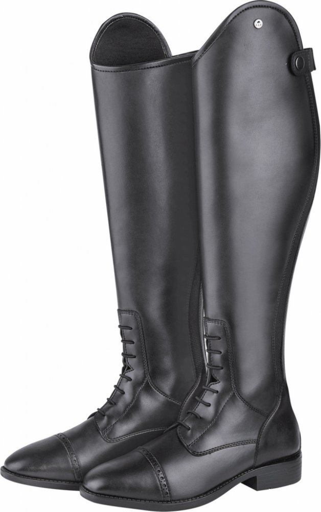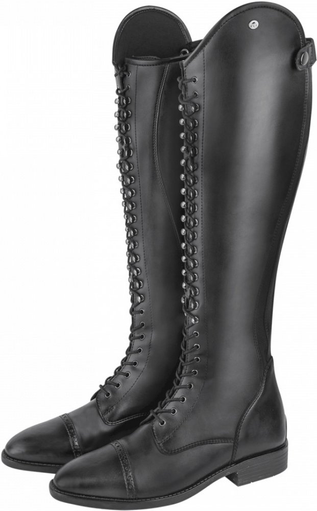 Vysoké jezdecké boty, které poskytují těsný kontakt mezi koněm a jezdcem. Opatřeny jsou šněrováním po celé délce, pomocí kterého se boty individuálně přizpůsobí. Mají dlouhý zip za zadní straně, který zajišťuj pohodlně a snadné obouvání. Zip je jištěn drukem a je opatřen z obou stran elastickou vložkou. Mají snadno čistitelný vnější materiál a protiskluzovou podrážku. Dodávány jsou včetně třpytivý...