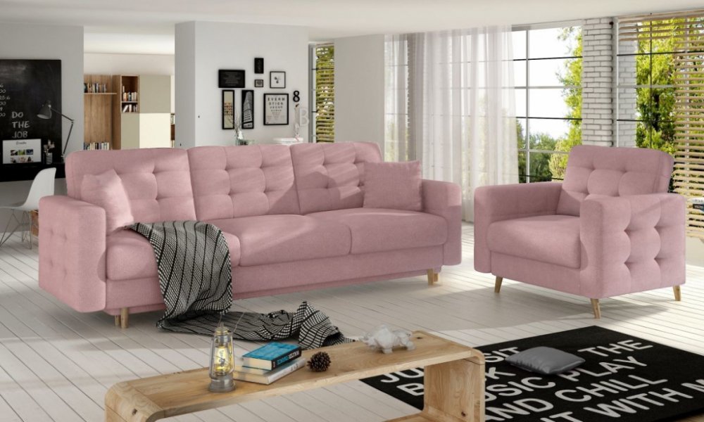Díky použití vlnité pružiny a pěny T25 je sedák pohovky a křesla mimořádně pružný, měkký a odolný vůči jakékoli deformaci. Oceníte také jednoduchý tvar, elegantní provedení a bezpečnou konstrukci.