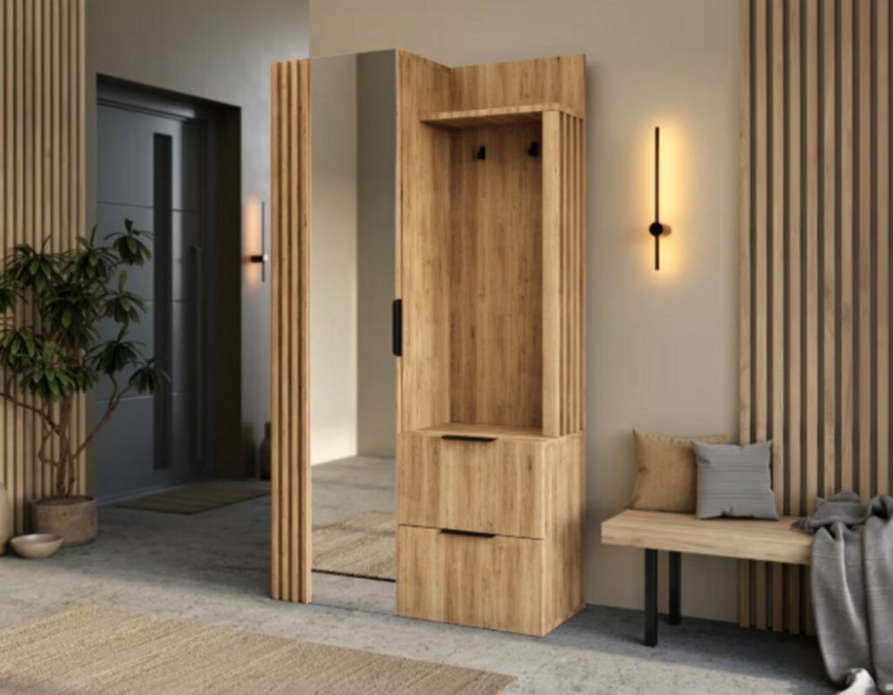 Stěna je vyrobena v dekoru dub artisan, který působí teple, přírodně a dokonale ladí s moderními interiéry. Výrazným prvkem jsou vertikální lamely, které dodávají nábytku prémiový vzhled. Praktická výška 180 cm umožňuje pohodlné využití úložného prostoru i zrcadla na každodenní kontrolu outfitu.