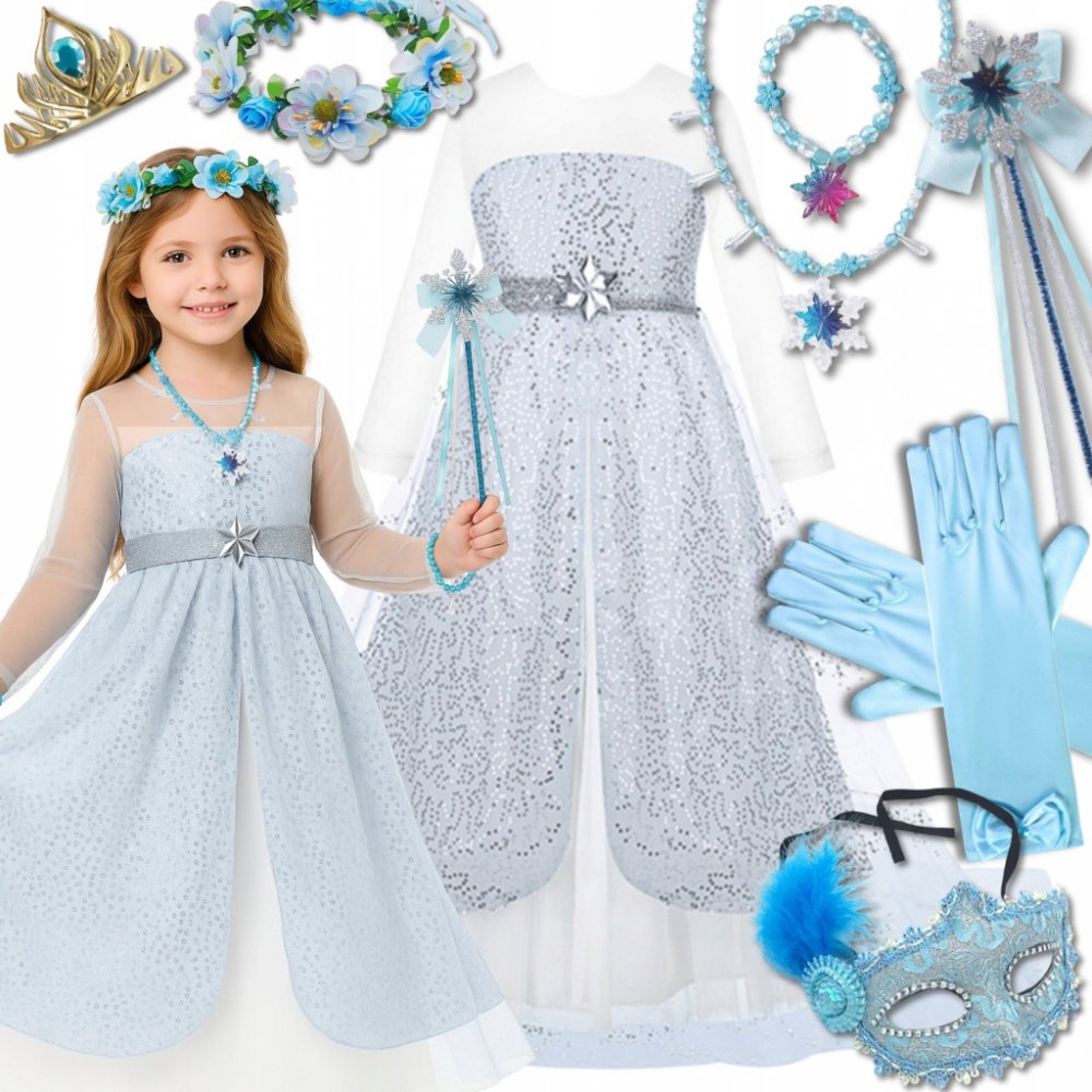 KOSTÝM PŘEVLEK ŠATY ELZA ELSA LEDOVÉ KRÁLOVSTVÍ TREN NA KARNEVALOVÝ PLES 140 / 146 CM (S VISAČKOU 150) SADA❄ Tato modro-stříbrná šaty zajistí, že se každá holčička bude cítit jako opravdová Sněhová královna – lesklá, jedinečná a připravená na pohádkový karnevalový ples!❄ Proč si vybrat náš kostým?