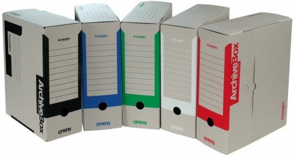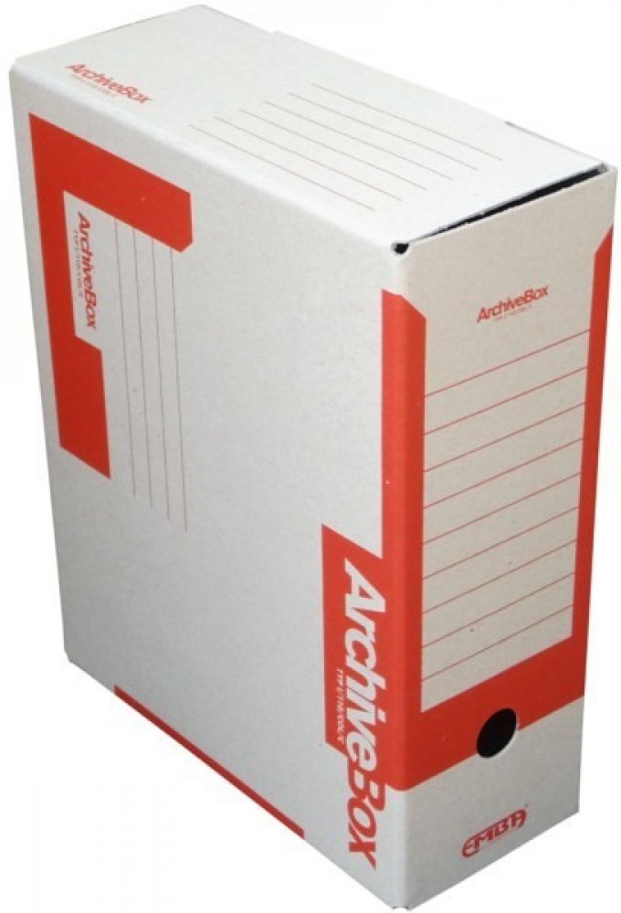 Archivační box na dokumenty formátu A4, uzavíratelná konstrukce. Šířka hřbetu 110 mm. Červený potisk.