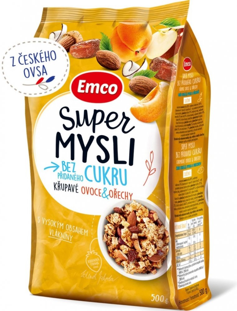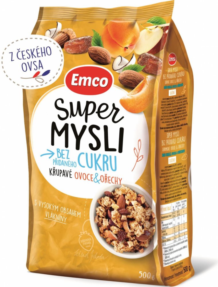 Emco Super mysli ovoce a ořechy 500 g. Super mysli s ovocem a ořechy je prémiové křupavé mysli, které neobsahuje žádný přidaný cukr ani umělá sladidla. Mysli je tvořeno neodolatelnou kombinací křupavých ořechů a šťavnatého ovoce (meruňky, fíky a jablka). Samozřejmostí je absence palmového tuku a přidaných barviv. Složení : Celozrnné ovesné vločky 39 %, vláknina z kořene čekanky 19 %, pšeničné vločky 13 %, řepkový olej, sušené meruňky 5 % (meruňky 95 %, rýžová mouka), sušené fíky 4 % (fíky 94 %, rýžová mouka), kukuřično– pšeničná křupka (kukuřičná krupice, pšeničná mouka, pšeničná krupice, kukuřičná mouka), pražené mandle 3 %, kousky sušených jablek 3 %, strouhaný kokos 1,7 %, pšeničná mouka, přírodní aroma, antioxidanty (askorbylpalmitát, přírodní extrakt s vysokým obsahem tokoferolů). Výrobek může obsahovat arašídy, sóju, mléko a další ořechy. Skladování: Skladujte na temném, chladném a suchém místě.