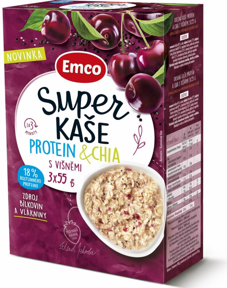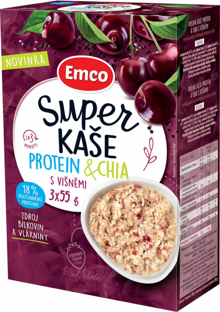 Složení: Ovesné vločky 64 %, cukr, sójová křupka 12 % (sójový izolát 87 %, tapiokový škrob, jedlá sůl), chia semínka 3,8 %, kousky mrazem sušených višní 1,3 % (100% višně), bramborový škrob, jedlá sůl, regulátor kyselosti: kyselina citrónová, přírodní aroma. Výrobek může obsahovat arašídy, ořechy a mléko.
